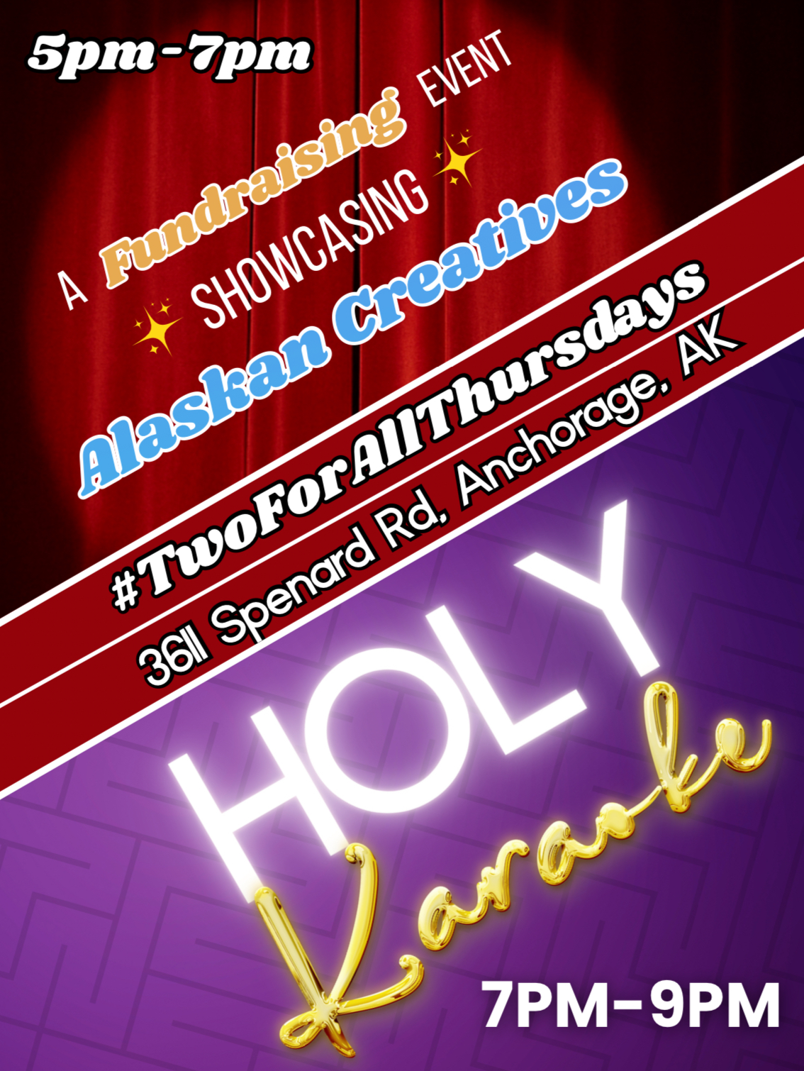 A sober, welcoming Thursday fundraising event featuring creative artist spotlight/open mic from 5–7 PM and holy karaoke from 7–9 PM